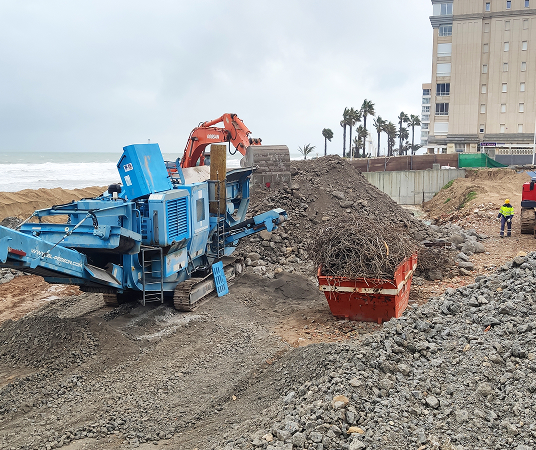 Contamos con una planta móvil especializada para procesar materiales de demolición y construcción, transformándolos en recursos útiles para nuevos proyectos.